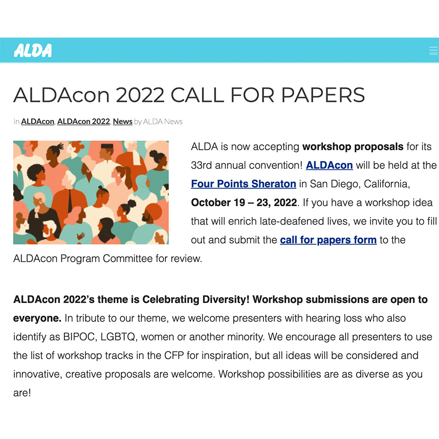 ALDAcon 2022’s theme is Celebrating Diversity! Workshop submissions are open to everyone. In tribute to our theme, we welcome presenters with hearing loss who also identify as BIPOC, LGBTQ, women or another minority. We encourage all presenters to use the list of workshop tracks in the CFP for inspiration, but all ideas will be considered and innovative, creative proposals are welcome. Workshop possibilities are as diverse as you are!